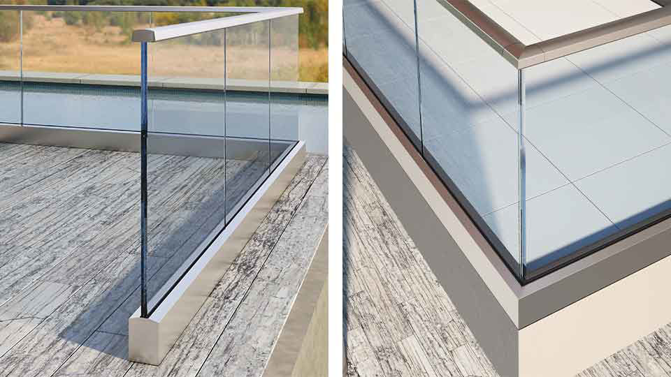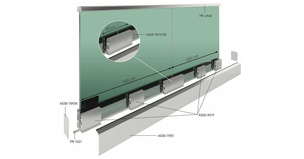 BTS AS50 Sistem de pantofi de bază din aluminiu cu suport de sticlă de rezistență pentru balustrade din sticlă fără cadru. Sistemul AS50 fixează sticla cu pantofi de bază din aluminiu de 15 cm și 30 cm, care sunt prefabricați și gata de instalat… Materialele de fixare precum pană de plastic, distanțier și cheia de blocare a panei sunt incluse în pantofii de bază din aluminiu. După fixarea ochelarilor cu încălțăminte de bază din aluminiu, sistemul este închis cu capace de placare din profil de aluminiu de 6 metri lungime. Capacele pot fi anodizate sau acoperite cu pulbere ral.