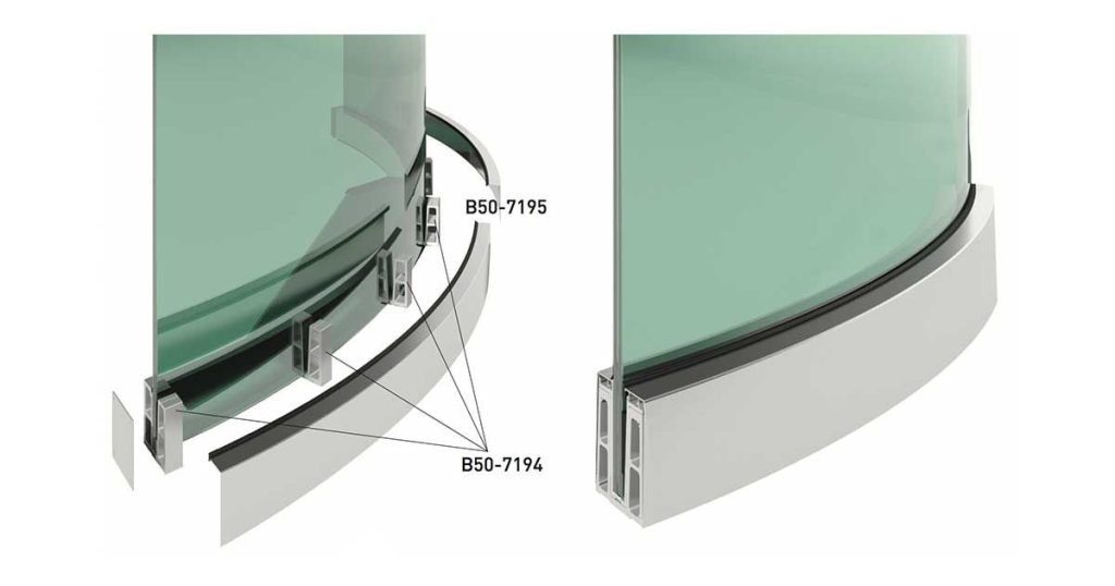 Sistemul de balustradă din sticlă curbată BTS B50 este potrivit pentru îndoire și instalare. Sistemul are pantofi de bază de 5 cm sau profil de aluminiu de 200 cm pe toată lungimea pentru fixarea geamurilor de sticlă. Cu ajutorul unor pene de plastic, fixați cu ușurință sticla în pantofii de bază. Capacele din aluminiu au o grosime suficientă pentru a fi îndoite. Puteți face procesul de îndoire în funcție de dimensiunile razei din proiectele dvs.