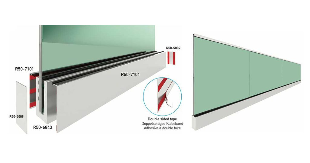 Profilul de încălțăminte cu bază pătrată de rezistență BTS Aluminiu R50 permite utilizarea sticlei de până la 25 mm. Sistemul poate fi utilizat în aplicare bucată cu bucată sau ca profil liniar continuu. Poate fi placat cu profile de acoperire din aluminiu cu diferite culori de anodizare sau vopsire cu pulbere. Cea mai critică componentă a unui sistem de balustrade este atașarea corectă a pantofului de bază la substrat. Sistemul R50 permite o instalare ușoară la standarde înalte.