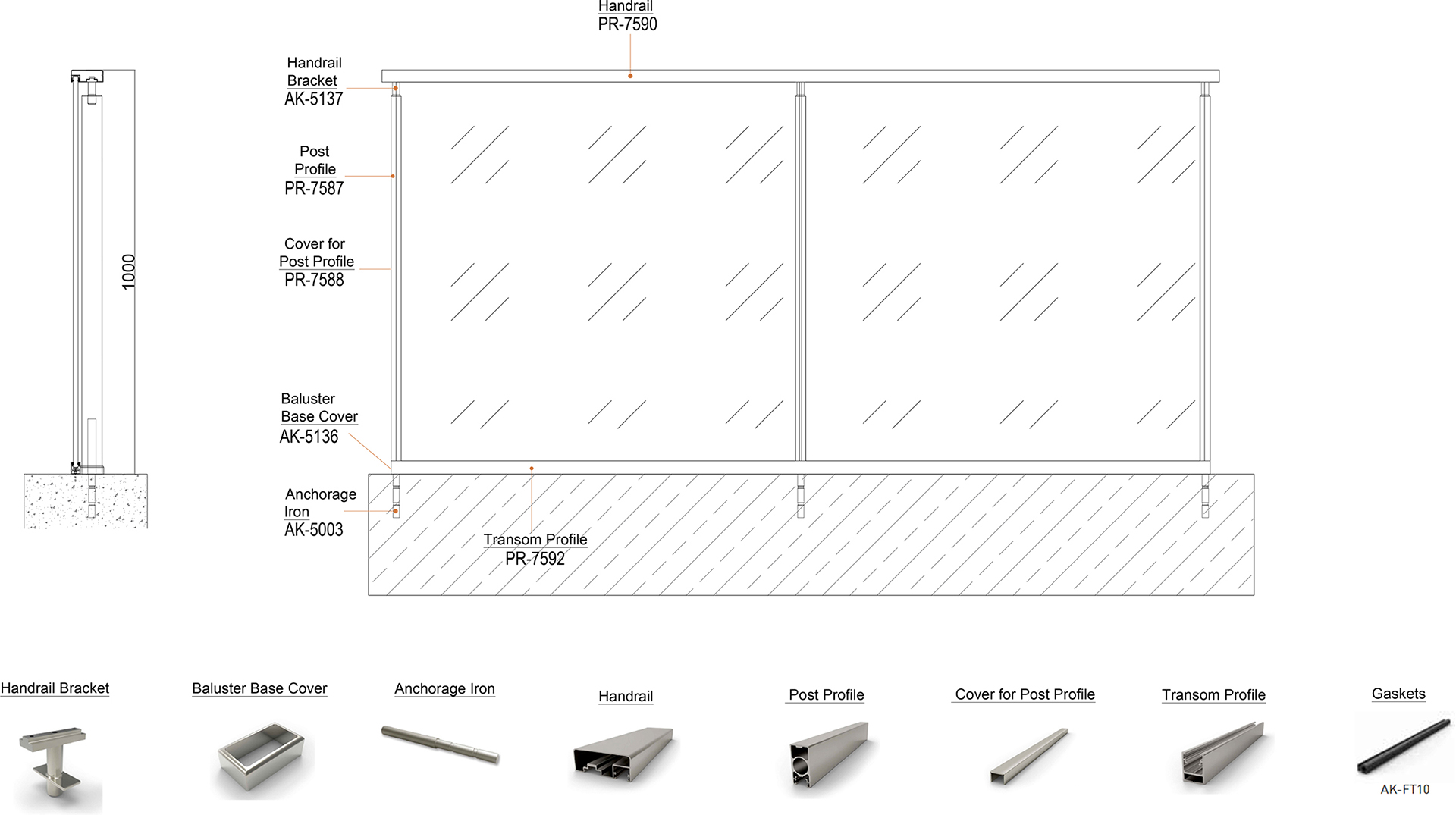 Seria SL folosește sticlă securizată laminată, care permite proiectarea balustradelor de balcon vitrate care se disting prin diverse texturi și scheme de culori. Sistemul are profil de stâlp de balustradă de 25x50mm și profil de balustradă de 80x30mm. Sticla este așezată și fixată pe profilul de bază care este fixat pe sol. SL15 este un sistem de balustrade din aluminiu cu geam complet frontal!